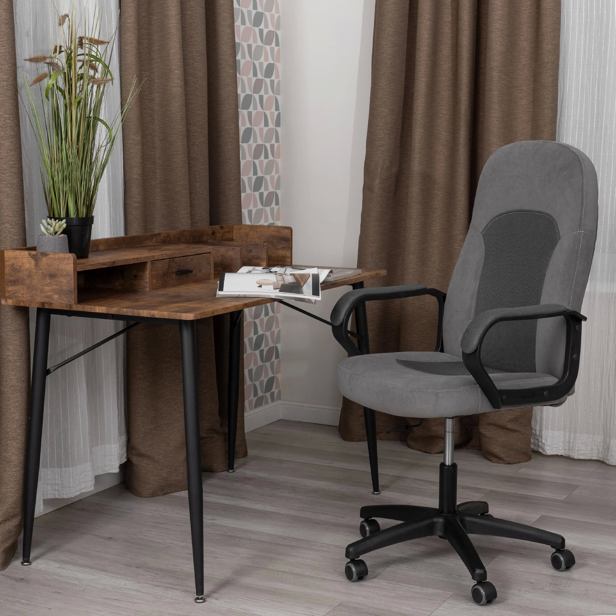 Офисное кресло PARMA — это элегантный и современный элемент, который эффективно дополняет любой интерьер. Отличаясь стильным дизайном, оно подходит как для руководителей, так и для обычных сотрудников. Кресло идеально подойдет как для офиса так для дома. Основные характеристики кресла PARMA: - Каркас: Изготовлен из прочной фанеры толщиной более 10 мм, что гарантирует надежность и долговечность. Этот материал экологически безопасен. - Наполнитель: Анатомический прогиб и мягкое сиденье с наполнителем из пенополиуретана (до 35 кг/м2) стандартной плотности не меняет форму на протяжении длительного времени, хорошо пропускает воздух, не накапливает пыль обеспечивают удобство при длительной работе. - Регулировка: Кресло оснащено механизмом подъема для индивидуальной настройки высоты. - Крестовина и подлокотники*: Черная полиамидная крестовина выглядит стильно и устойчива, а фиксированные мягкие подлокотники помогают снять напряжение с шеи и плеч. - Ролики: Бесшумные полиамидные ролики с прорезиненными вставками защищают напольное покрытие и подходят для использования на низковорсовых поверхностях. - Стандарты: Ролики и крестовина соответствуют стандарту BIFMA, а газлифты 3 класса выдерживают вес до 100 кг. - Обивка: : Экокожа и велюр выдерживают до 50 000 циклов по Мартиндейлу. Кресло PARMA поставляется в разобранном виде и требует простой сборки по прилагаемой инструкции. Кресло PARMA станет хорошим выбором для тех, кто ценит не только комфорт, но и стиль в рабочем пространстве.