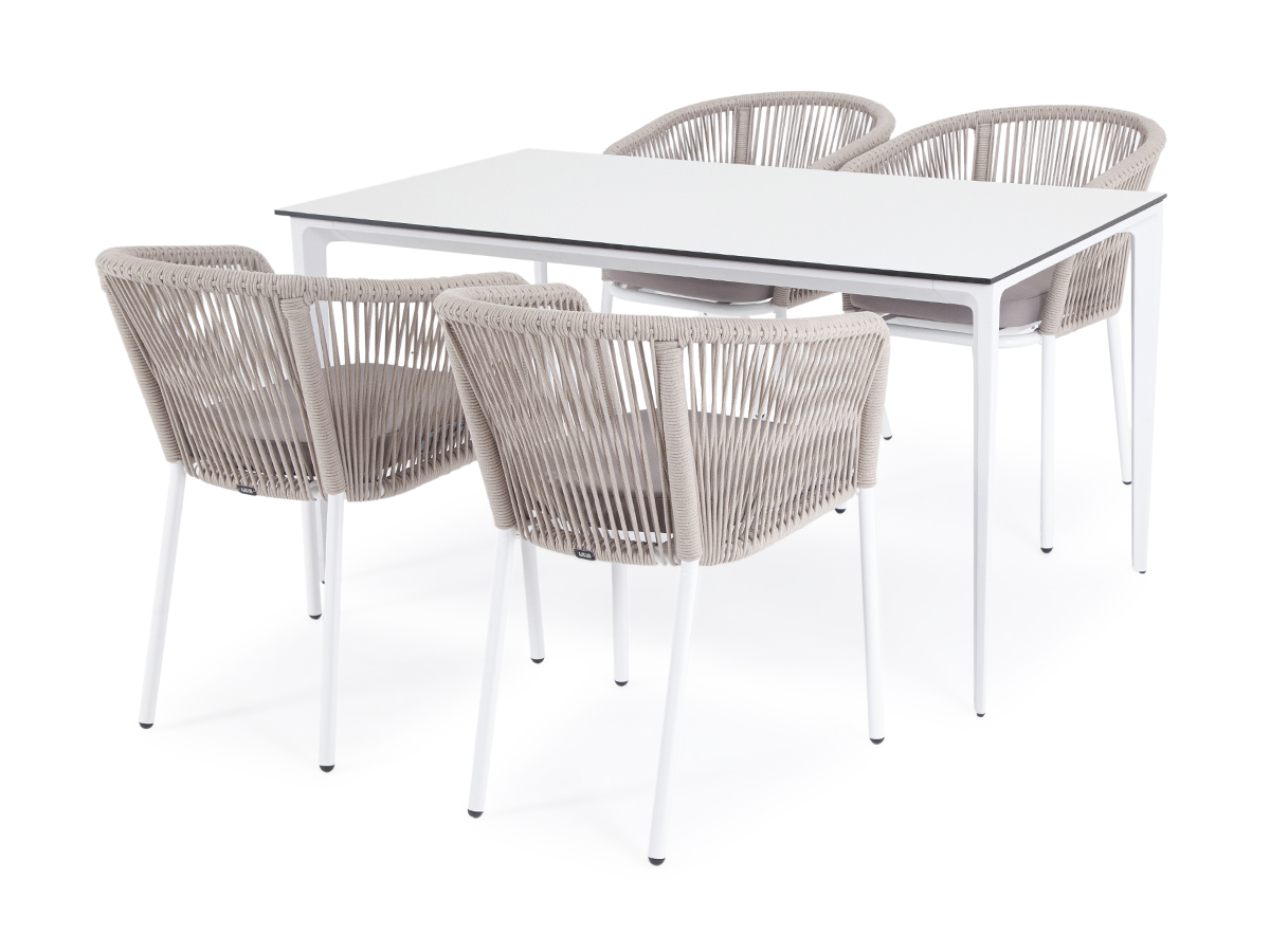 "Малага" обеденная группа на 4 персоны со стульями "Лион", каркас белый, роуп бежевый