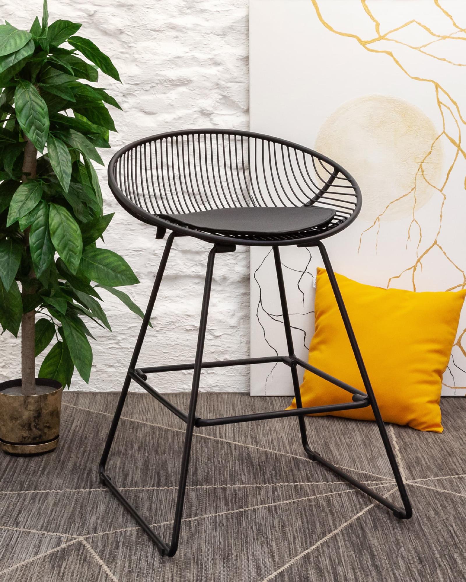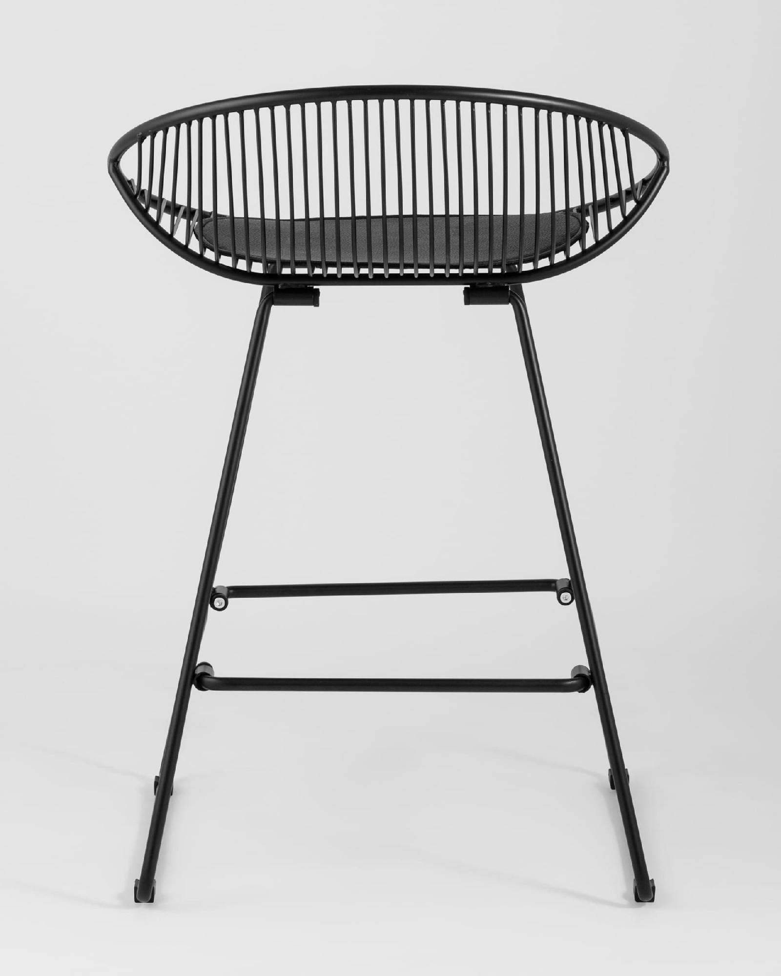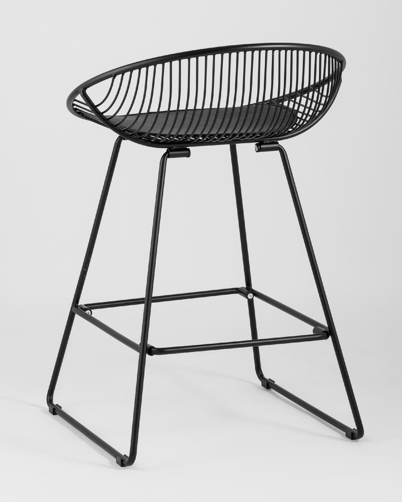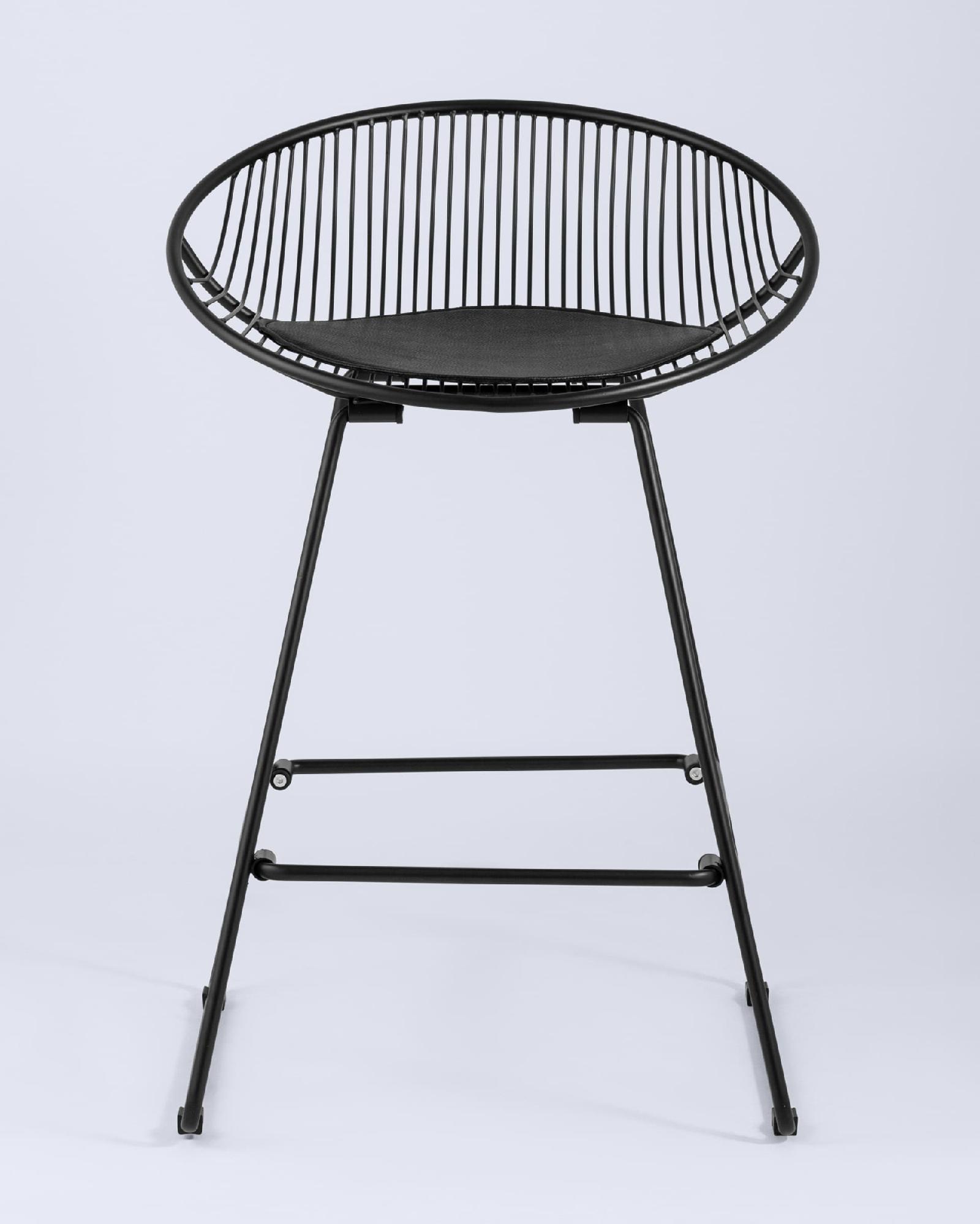 Необычный дизайн барного стула UFO станет акцентом интерьера кухни в современном стиле. Спинка и сидение выполнены из металлических прутьев черного цвета. Подушка изготовлена из черной экокожи. Ножки выполнены из металла в тон сидения и имеют подставки, которые предотвращают скольжение стула по поверхности пола.