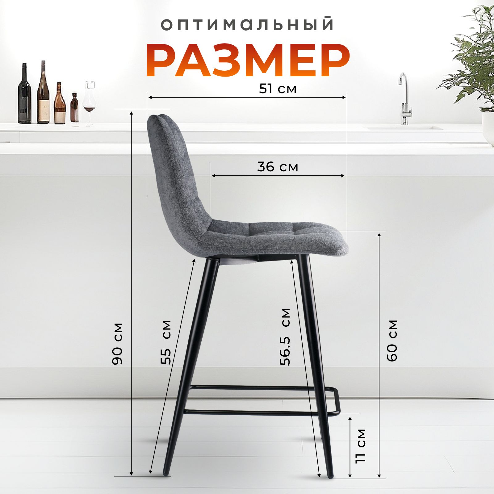 Стул полубарный Base букле темно-серый MOSS 996 от CASTL — стильное и удобное решение для пространств с барной стойкой или островом. Высота сиденья 60 см идеально подходит для столешниц высотой 85–92 см.